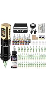 Nice set up, but I had to exchange it for the slightly more expensive one with the external power AND pedal. My mistake, but it IS comfy and quiet set up, though. I would buy your own expensive black ink as well; nothing's worse than faded colors. Mt professional tattoos are STILL bright 10 plus years later; and I live by the beach and do NOT ever wear sunblock. So quality ink is your friend. These little machines are a great deal!